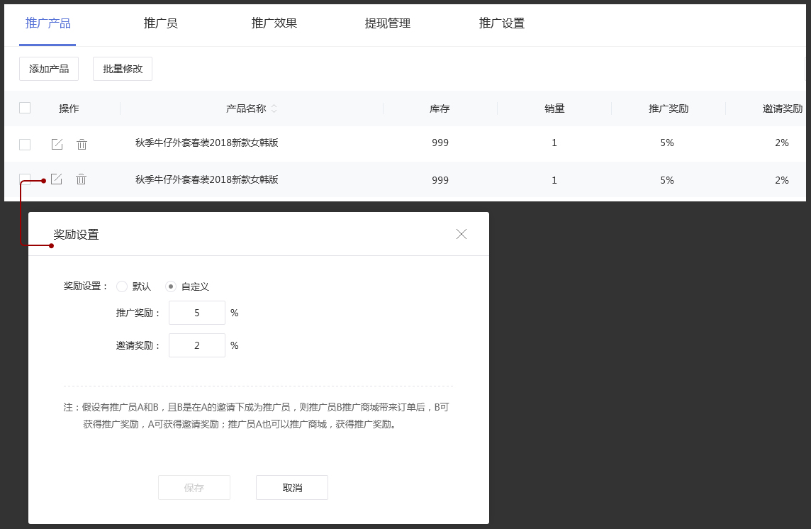 a.“推廣員設(shè)置”:分成4個(gè)部分,分別為“推廣員名稱”、“邀請(qǐng)獎(jiǎng)勵(lì)”、“客戶保護(hù)期”、“規(guī)則說明”。