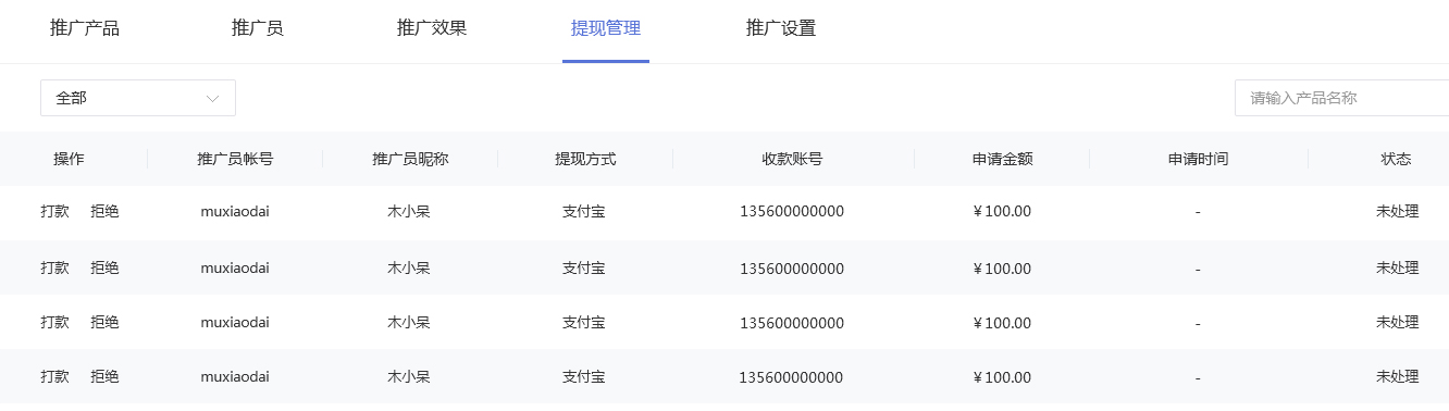 當(dāng)選擇結(jié)算方式為“系統(tǒng)自動(dòng)結(jié)算”時(shí),商家只需在推廣員發(fā)起獎(jiǎng)勵(lì)提現(xiàn)時(shí),進(jìn)入“網(wǎng)站管理后臺(tái)--營(yíng)銷--推廣員--提現(xiàn)管理”處點(diǎn)擊【打款】,系統(tǒng)會(huì)自動(dòng)打款到推廣員的提現(xiàn)賬戶。“系統(tǒng)自動(dòng)結(jié)算”支持提現(xiàn)到支付寶和微信零錢,但商家成功使用此結(jié)算方式的前提是:已在網(wǎng)站管理配置微信支付,并在微信支付商戶平臺(tái)開通了企業(yè)付款功能;已在網(wǎng)站管理配置支付寶支付,并在支付寶商戶平臺(tái)開通了單筆轉(zhuǎn)賬到支付寶功能。