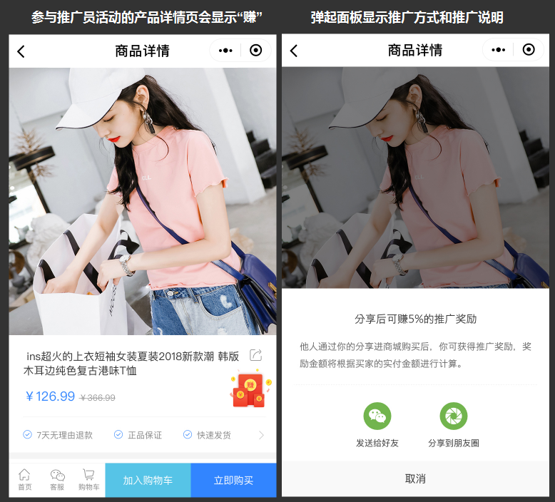 b.在參與推廣活動(dòng)的產(chǎn)品的產(chǎn)品詳情頁(yè)點(diǎn)擊“賺”的標(biāo)識(shí),將產(chǎn)品分享給好友或朋友圈。